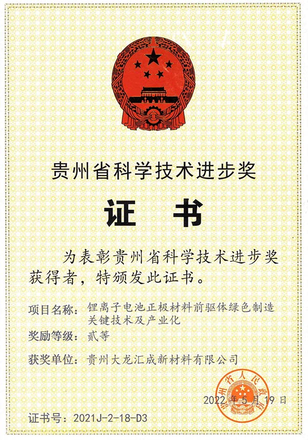 貴州大龍匯成新材料有限公司,聯合相關院校及企業(yè)申報的《鋰離子電池正極材料前驅體綠色制造關鍵技術及產業(yè)化》獲貴州省科學技術進步獎二等獎。
